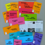 Zu 10 Ausstellungen gibt es Plakate, Flyer und Einladungskarten. Das Team stellt sich in einem Heft vor und zu einer weiteren Ausstellung ist eine kleine Broschüre entstanden.